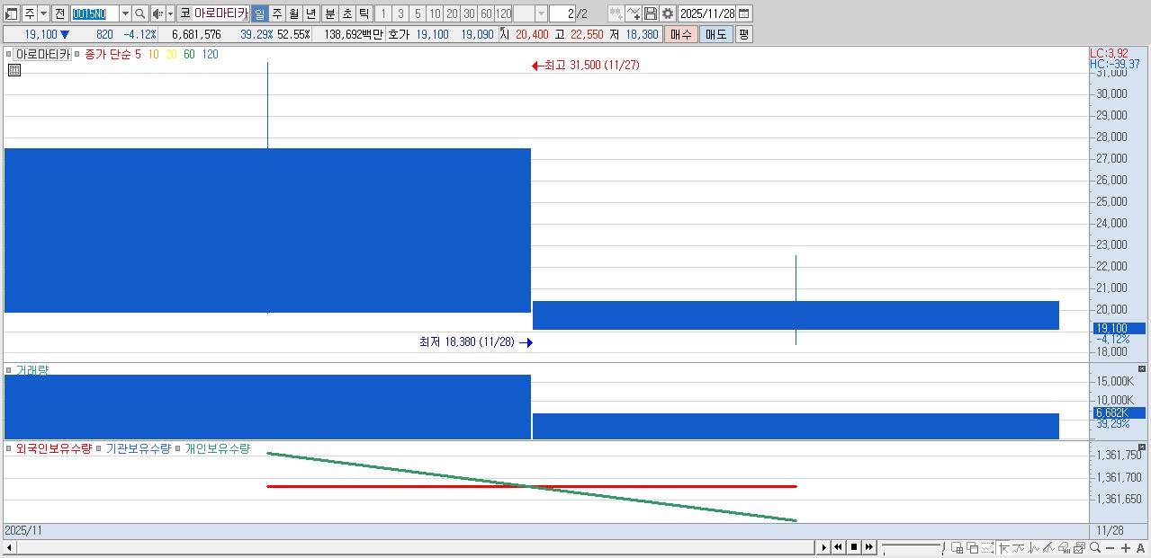 - 아로마티카 (19,100원 ▼ -4.12% , 시총: 2,429억, 거래량: 6,681,576, 거래대금:1,387억)