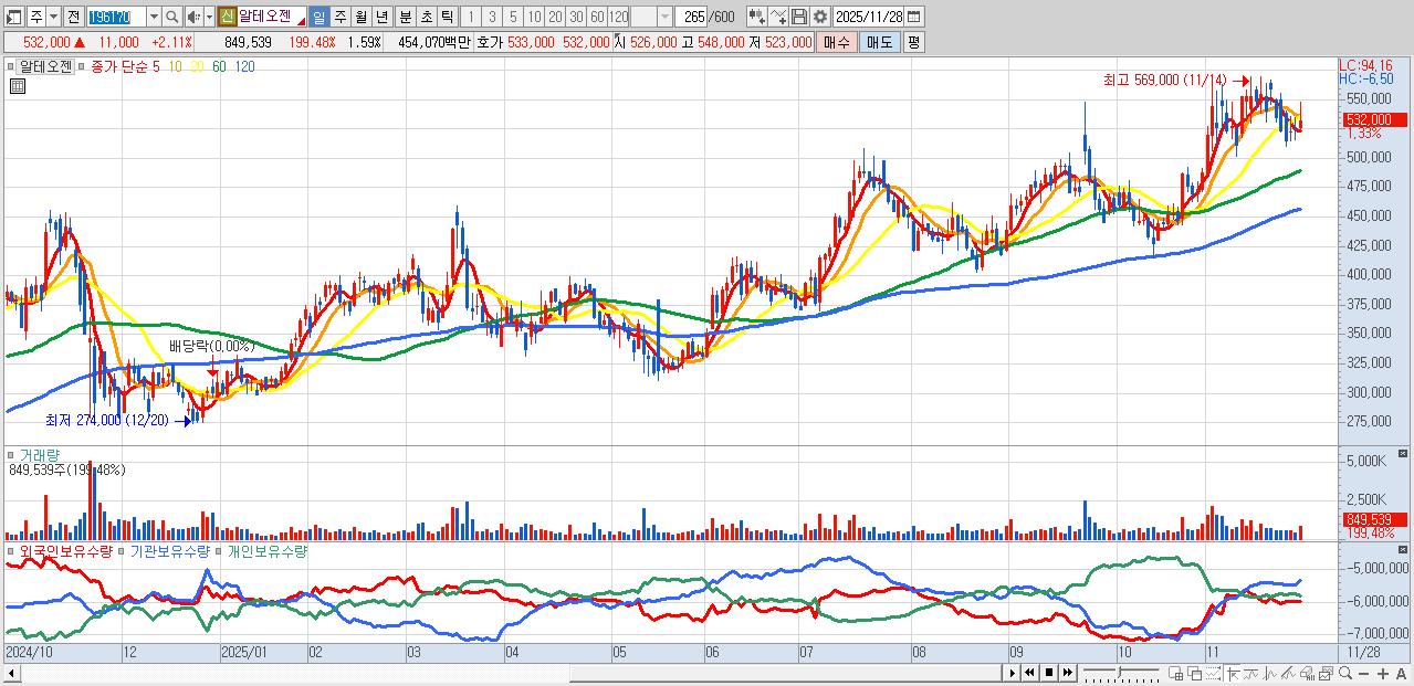 - 알테오젠 (533,000원 ▲ 2.3% , 시총: 285,186억, 거래량: 471,784, 거래대금:2,523억)