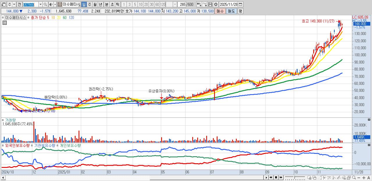 - 이수페타시스 (144,000원 ▼ -1.57% , 시총: 105,709억, 거래량: 1,645,698, 거래대금:2,328억)
