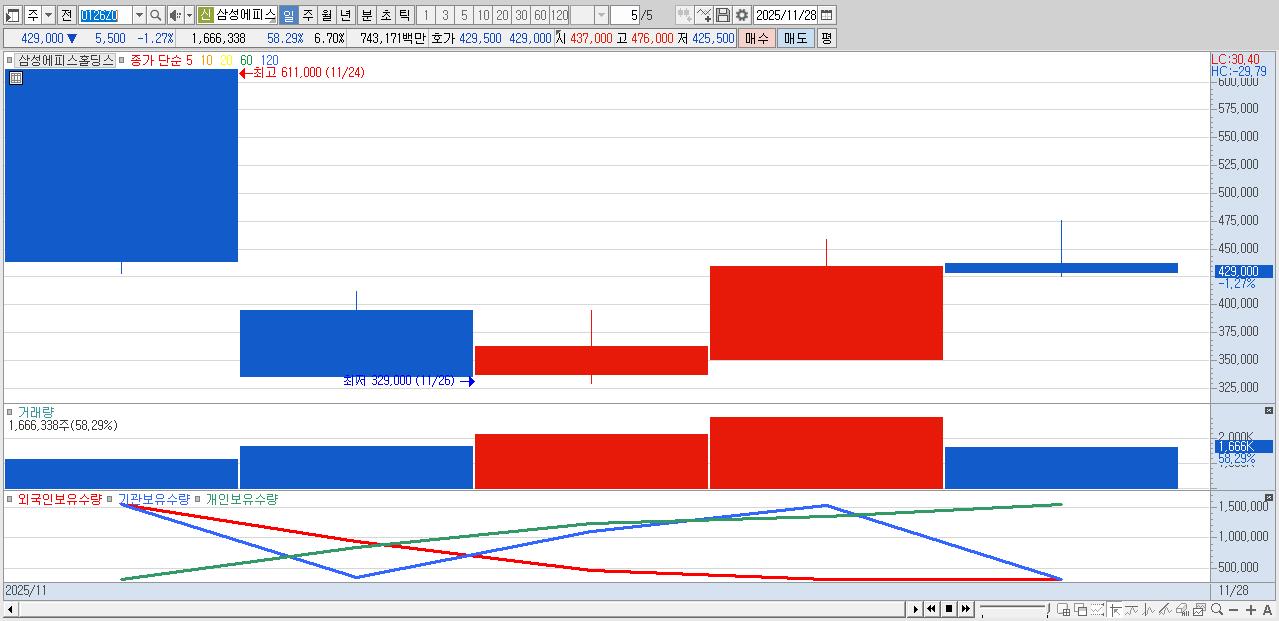 - 삼성에피스홀딩스 (429,000원 ▼ -1.27% , 시총: 106,748억, 거래량: 1,666,338, 거래대금:7,432억)