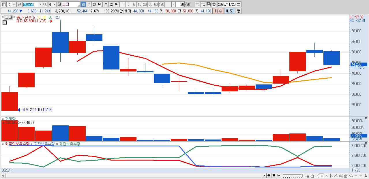 - 노타 (44,200원 ▼ -11.24% , 시총: 9,354억, 거래량: 3,738,461, 거래대금:1,803억)