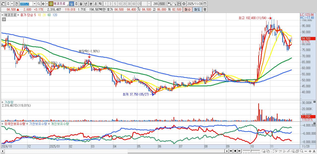 - 에코프로 (84,500원 ▲ 3.17% , 시총: 114,731억, 거래량: 2,316,467, 거래대금:1,946억)