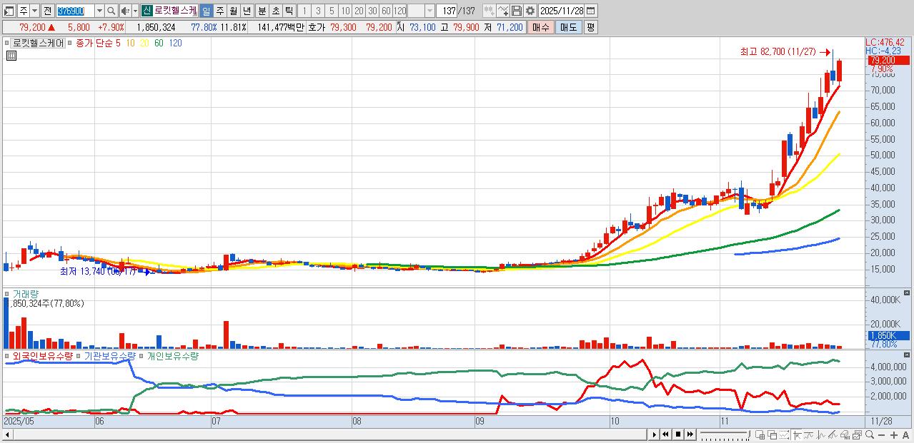 - 로킷헬스케어 (79,200원 ▲ 7.9% , 시총: 12,404억, 거래량: 1,850,324, 거래대금:1,415억)