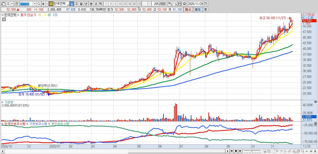 29.한국전력 52,500원 ▲ 1.16% (KOSPI, 015760)