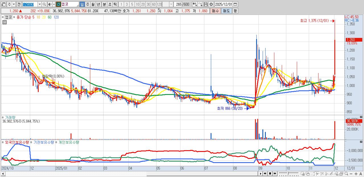 - 앱코 (1,260원 ▲ 19.09% , 시총: 574억, 거래량: 36,982,976, 거래대금:471억)