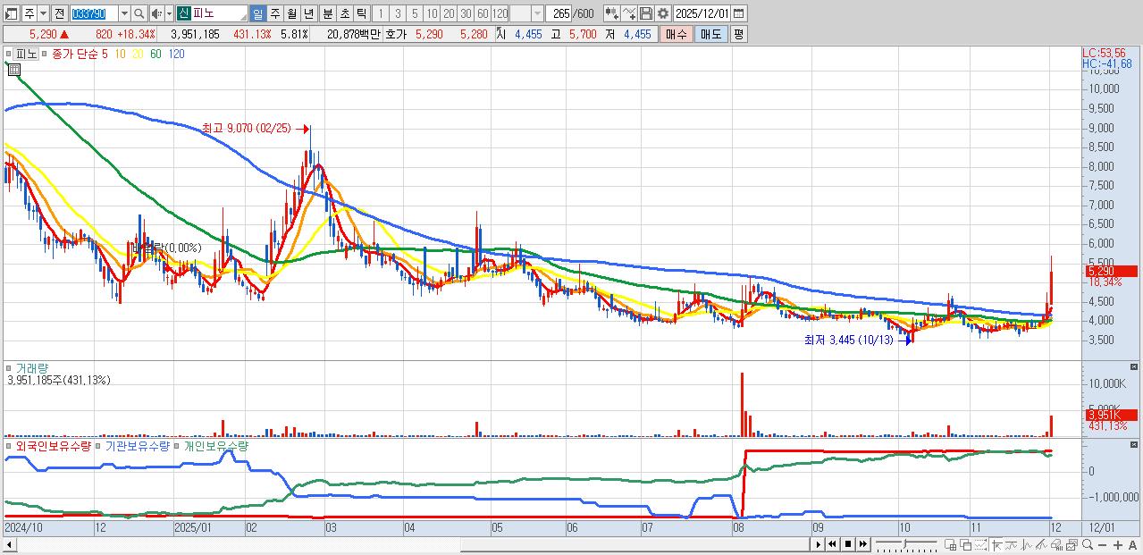 - 피노 (5,290원 ▲ 18.34% , 시총: 3,599억, 거래량: 3,951,185, 거래대금:209억)