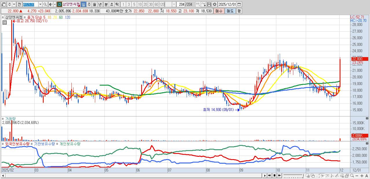 - 삼양엔씨켐 (22,000원 ▲ 18.73% , 시총: 2,408억, 거래량: 765,453, 거래대금:160억)