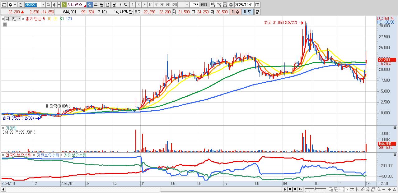 - 지니언스 (22,250원 ▲ 15.11% , 시총: 2,020억, 거래량: 188,644, 거래대금:41억)