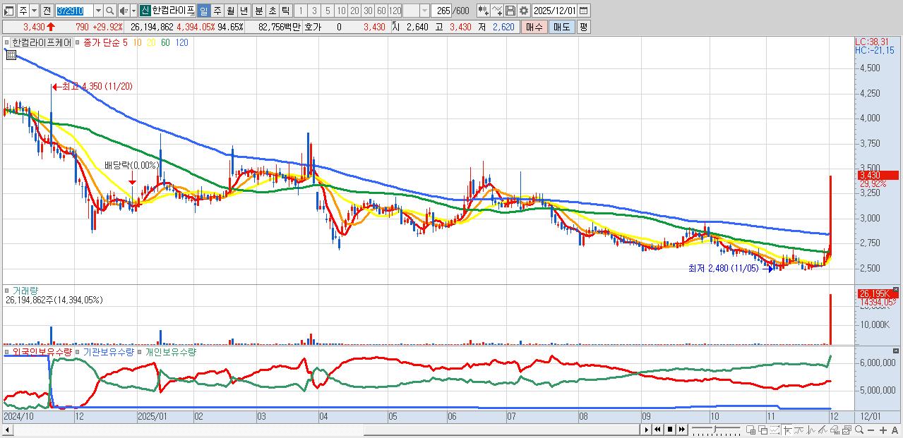 - 한컴라이프케어 (3,430원 ▲ 29.92% , 시총: 949억, 거래량: 26,194,862, 거래대금:828억)