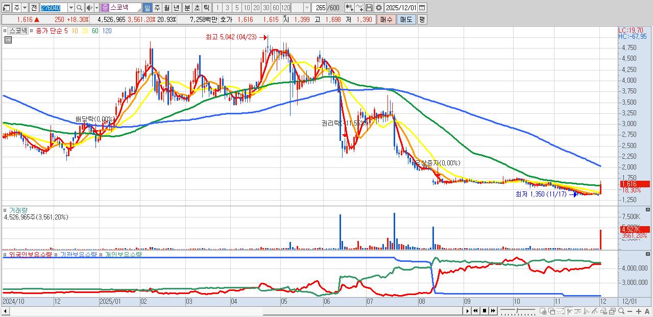 - 스코넥 (1,616원 ▲ 18.3% , 시총: 350억, 거래량: 4,526,965, 거래대금:73억)