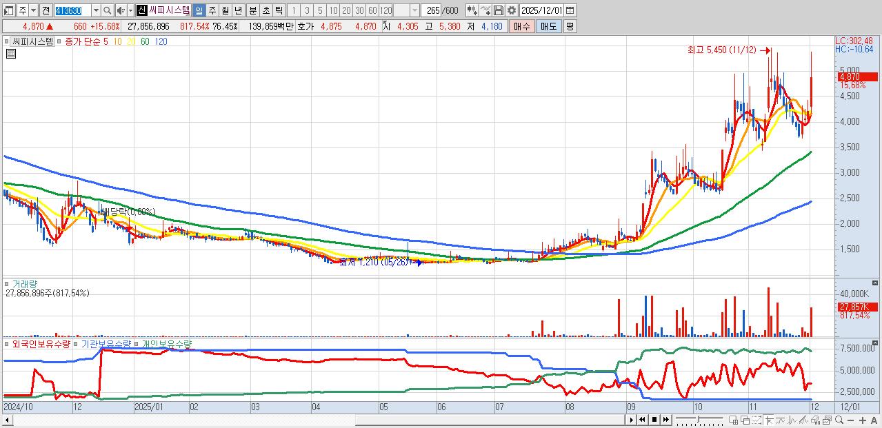 - 씨피시스템 (4,870원 ▲ 15.68% , 시총: 1,774억, 거래량: 27,856,896, 거래대금:1,399억)