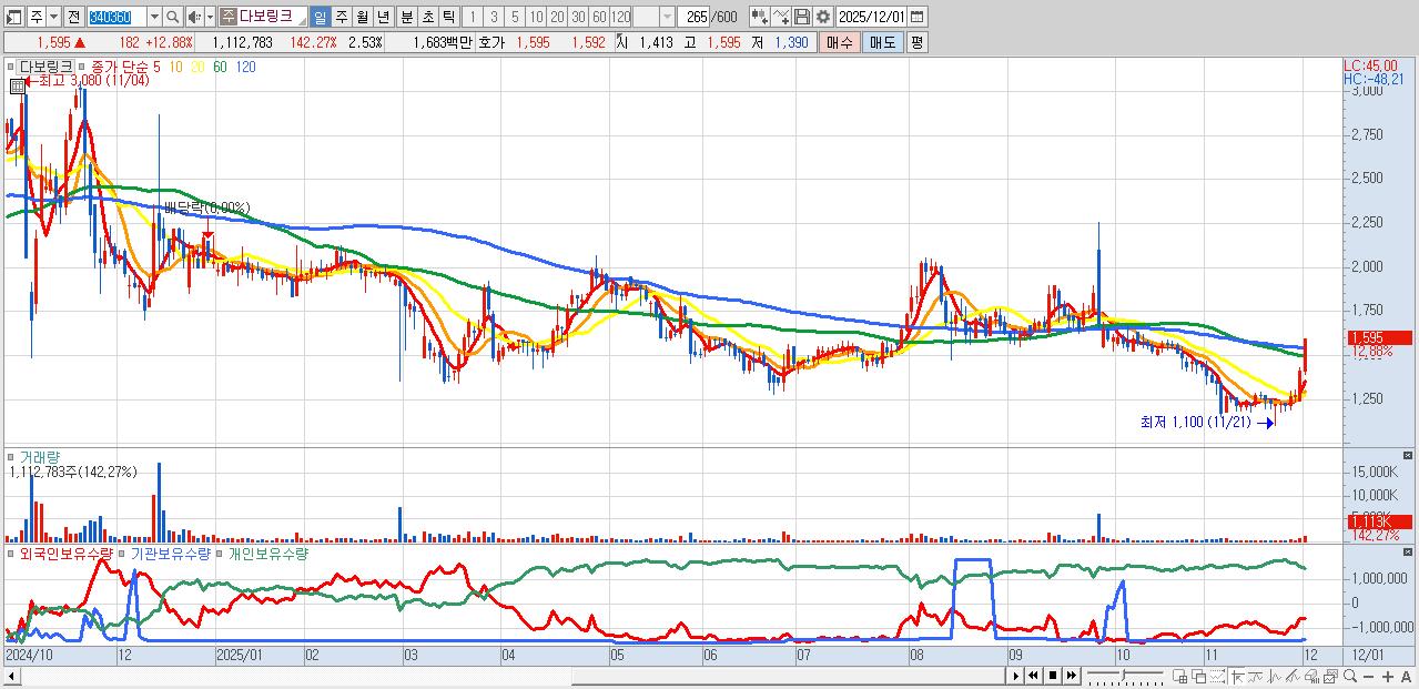 - 다보링크 (1,595원 ▲ 12.88% , 시총: 701억, 거래량: 1,112,783, 거래대금:17억)