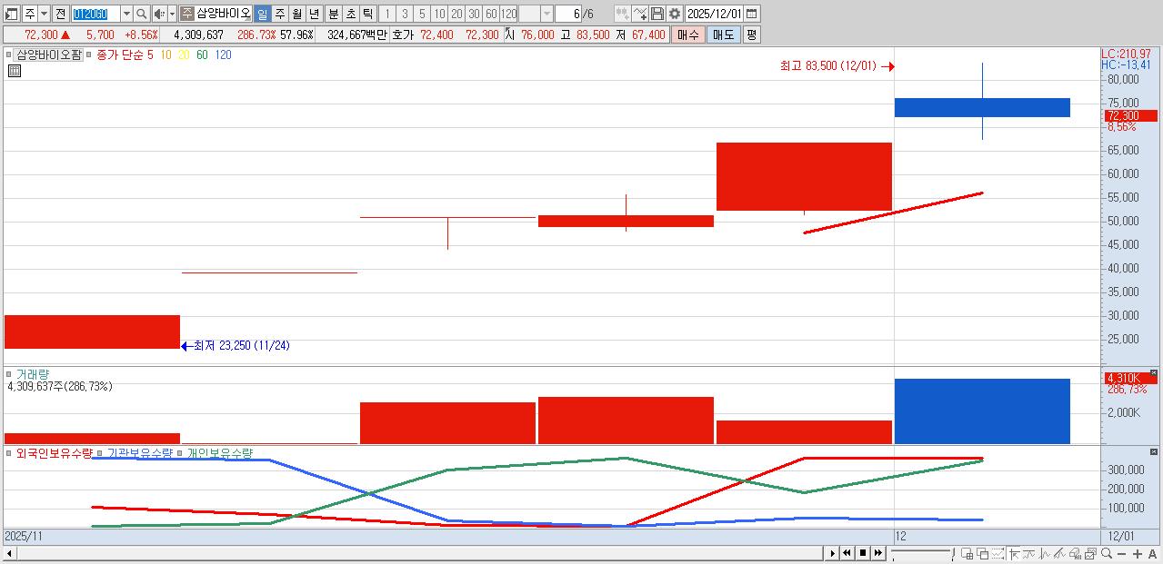 - 삼양바이오팜 (72,300원 ▲ 8.56% , 시총: 5,376억, 거래량: 4,309,637, 거래대금:3,247억)