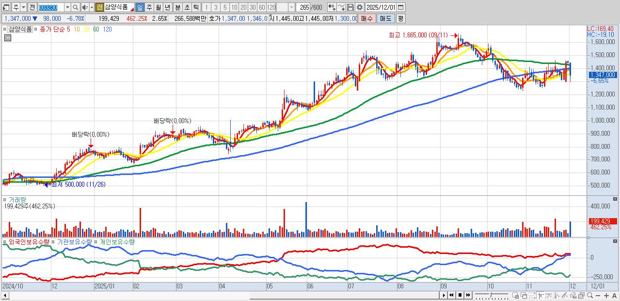 - 삼양식품 (1,346,000원 ▼ -6.85% , 시총: 101,394억, 거래량: 142,030, 거래대금:1,896억)