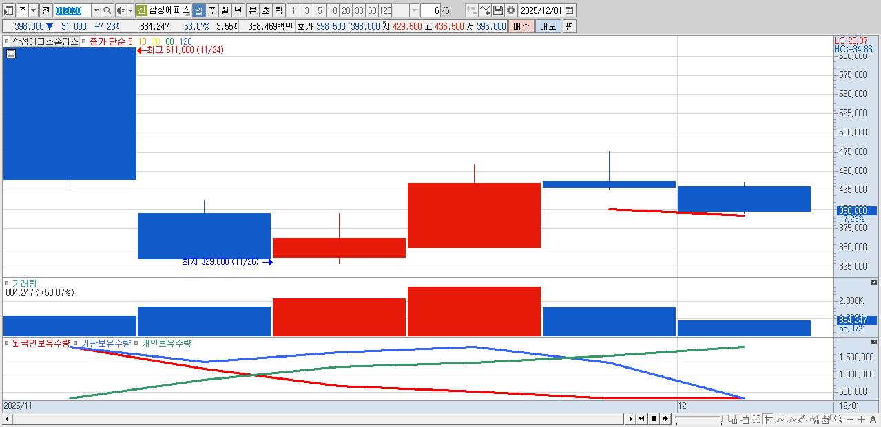 - 삼성에피스홀딩스 (398,000원 ▼ -7.23% , 시총: 99,035억, 거래량: 884,247, 거래대금:3,585억)