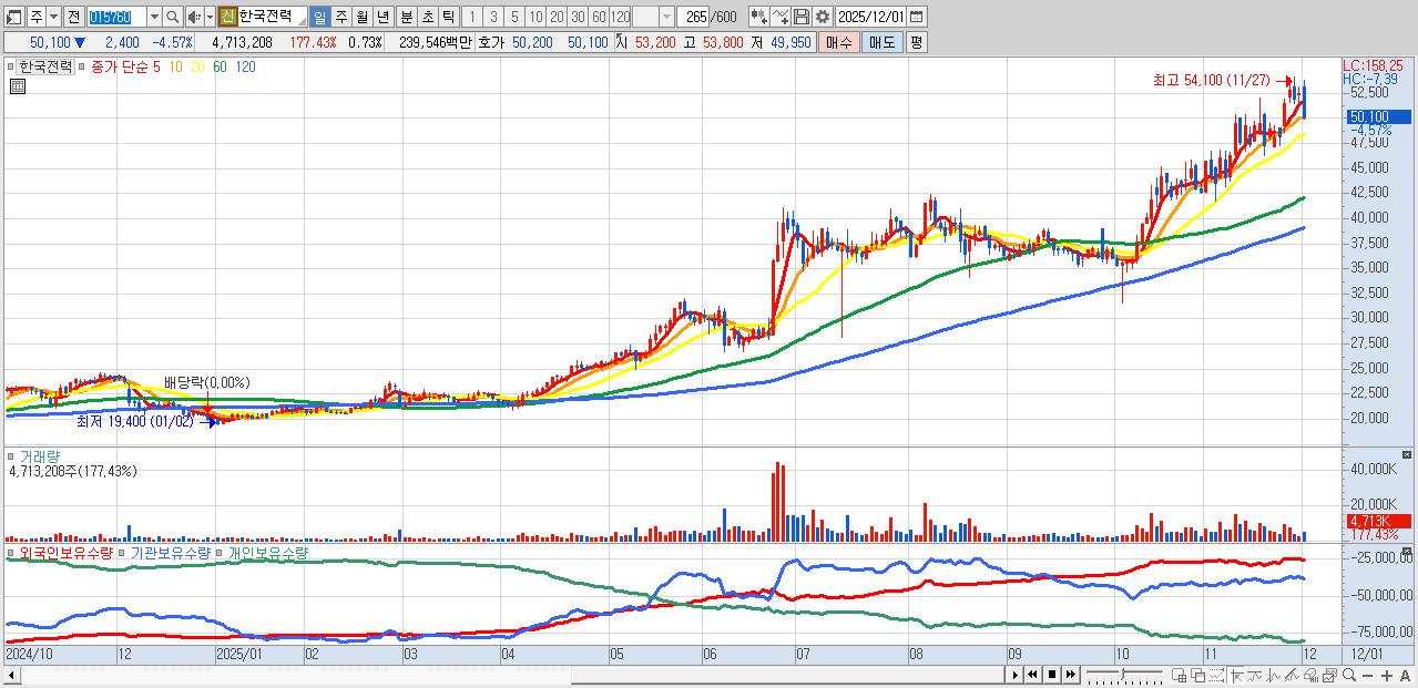 - 한국전력 (50,100원 ▼ -4.57% , 시총: 321,624억, 거래량: 4,713,208, 거래대금:2,395억)