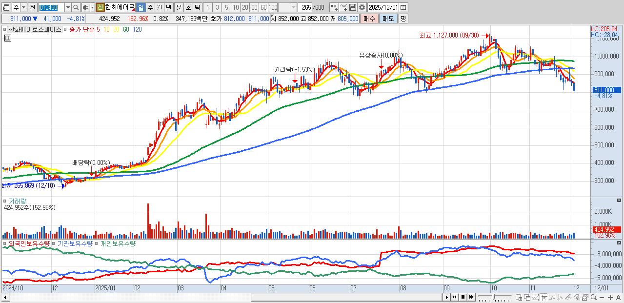 - 한화에어로스페이스 (813,000원 ▼ -4.58% , 시총: 419,210억, 거래량: 318,566, 거래대금:2,599억)