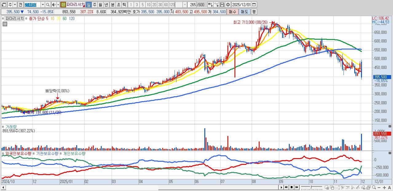 - 파마리서치 (398,500원 ▼ -15.21% , 시총: 41,403억, 거래량: 578,672, 거래대금:2,358억)