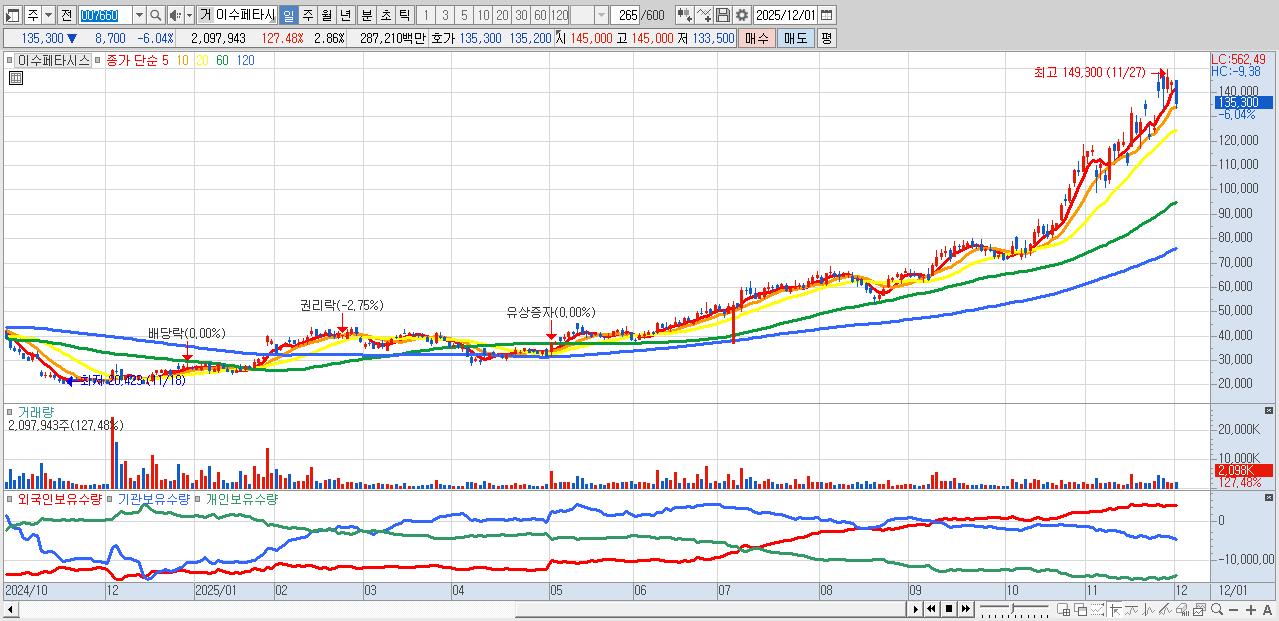 - 이수페타시스 (135,300원 ▼ -6.04% , 시총: 99,323억, 거래량: 2,097,943, 거래대금:2,872억)