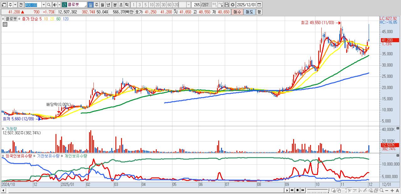 - 클로봇 (41,200원 ▲ 1.73% , 시총: 10,297억, 거래량: 12,507,302, 거래대금:5,664억)