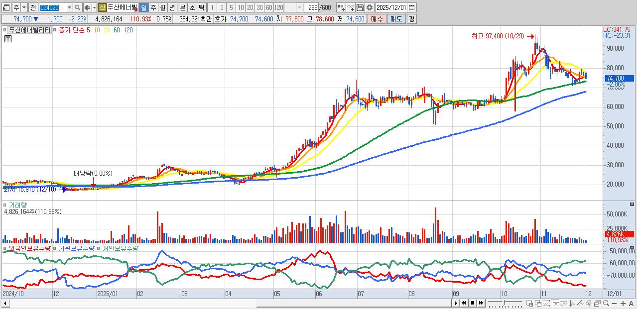 - 두산에너빌리티 (74,900원 ▼ -1.96% , 시총: 479,780억, 거래량: 2,242,179, 거래대금:1,689억)