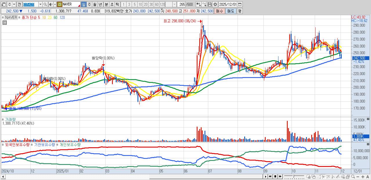 - NAVER (243,000원 ▼ -0.41% , 시총: 381,152억, 거래량: 666,662, 거래대금:1,627억)