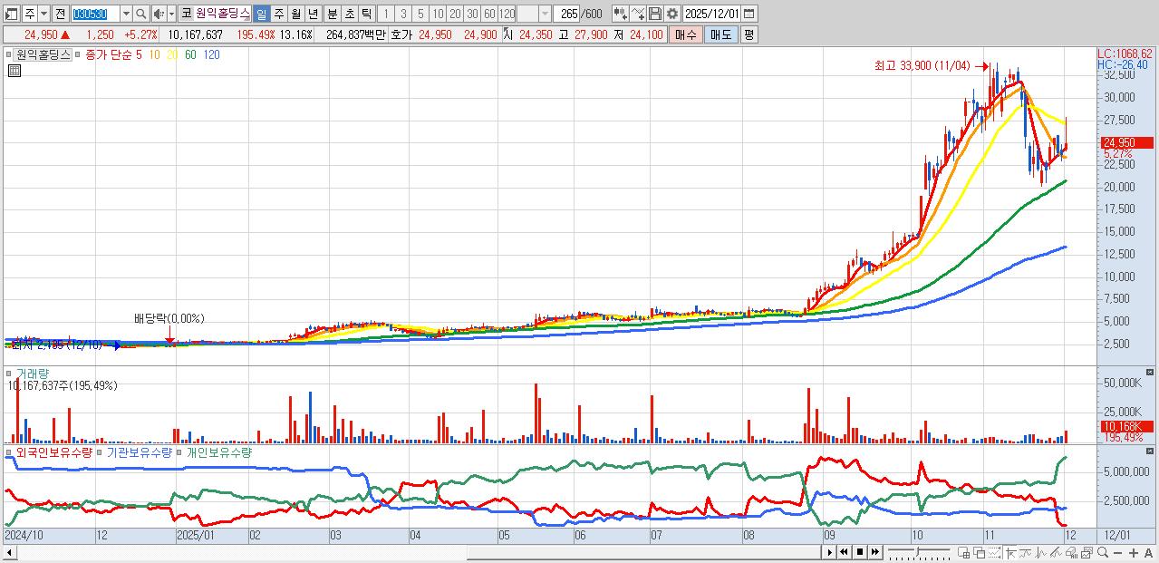 - 원익홀딩스 (24,950원 ▲ 5.27% , 시총: 19,271억, 거래량: 10,167,637, 거래대금:2,648억)