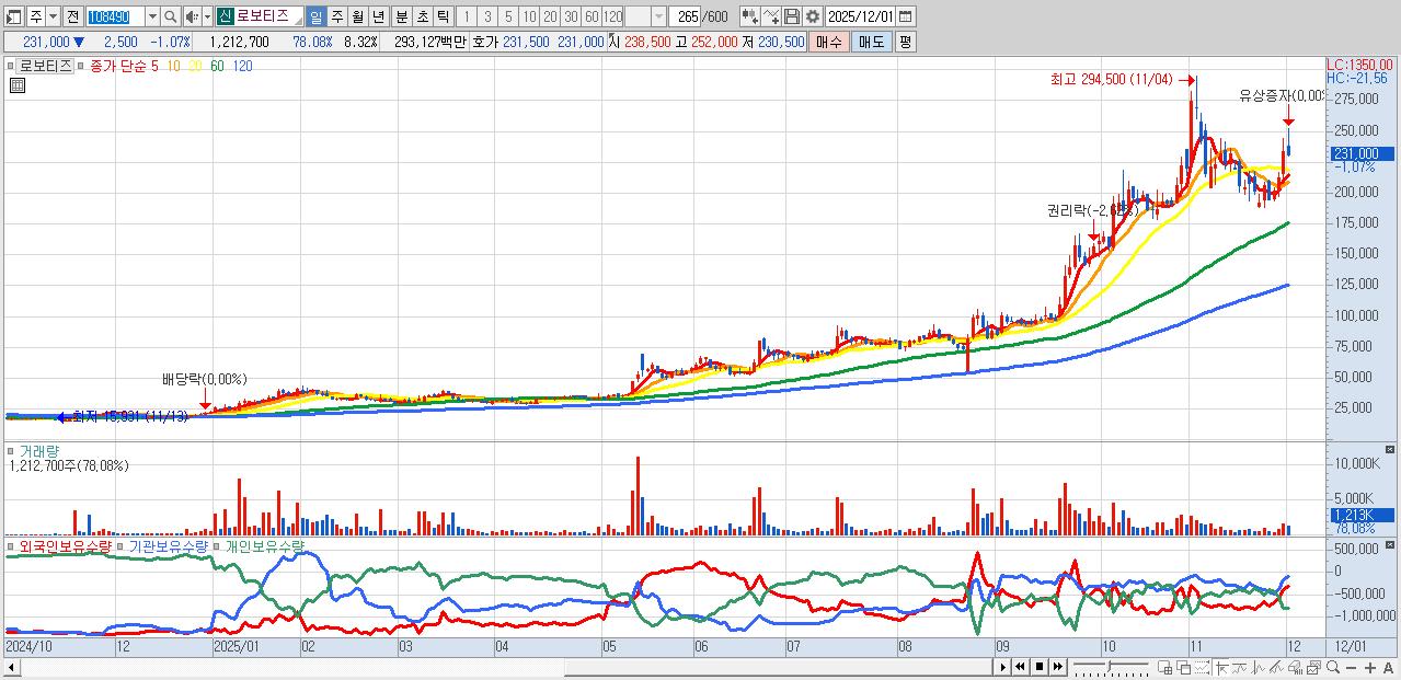 - 로보티즈 (231,000원 ▼ -1.07% , 시총: 33,657억, 거래량: 1,212,700, 거래대금:2,931억)