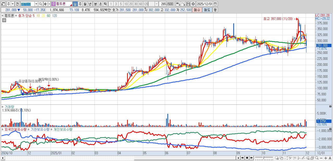 - 펩트론 (317,500원 ▼ -6.62% , 시총: 74,033억, 거래량: 494,556, 거래대금:1,570억)