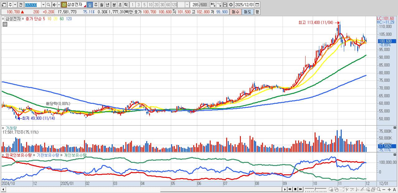 - 삼성전자 (100,800원 ▲ 0.3% , 시총: 5,966,995억, 거래량: 10,905,526, 거래대금:11,020억)
