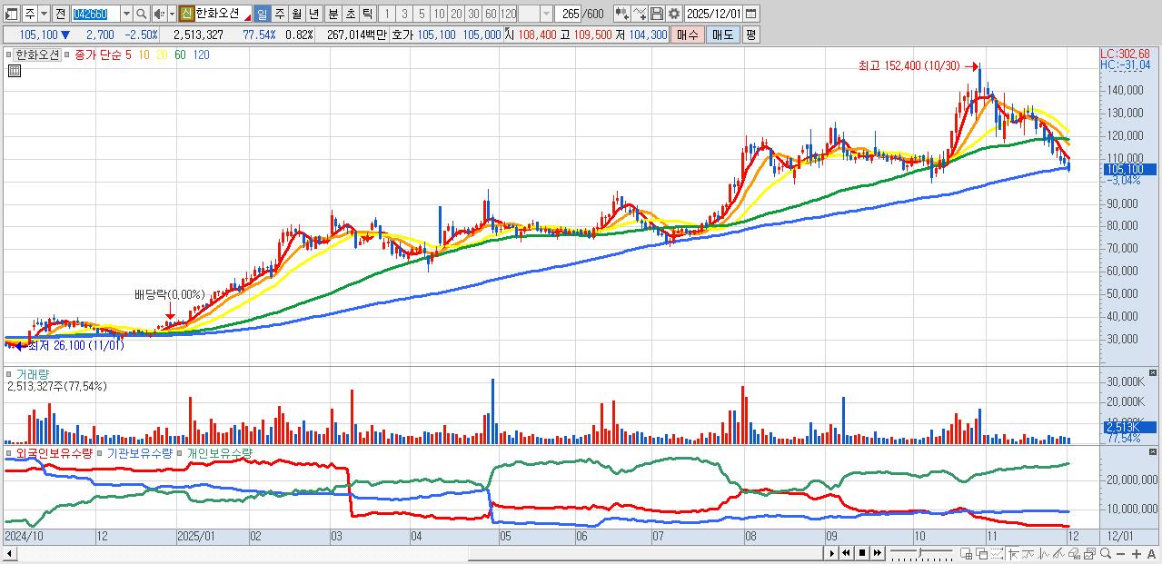 - 한화오션 (105,000원 ▼ -2.6% , 시총: 321,734억, 거래량: 1,316,451, 거래대금:1,397억)