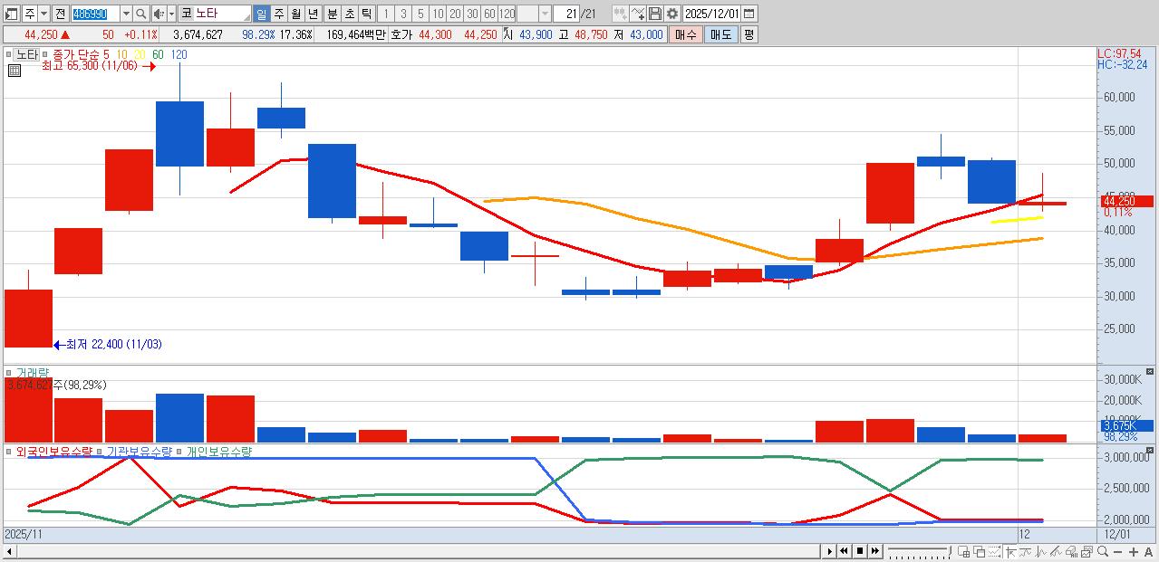 - 노타 (44,250원 ▲ 0.11% , 시총: 9,364억, 거래량: 3,674,627, 거래대금:1,695억)