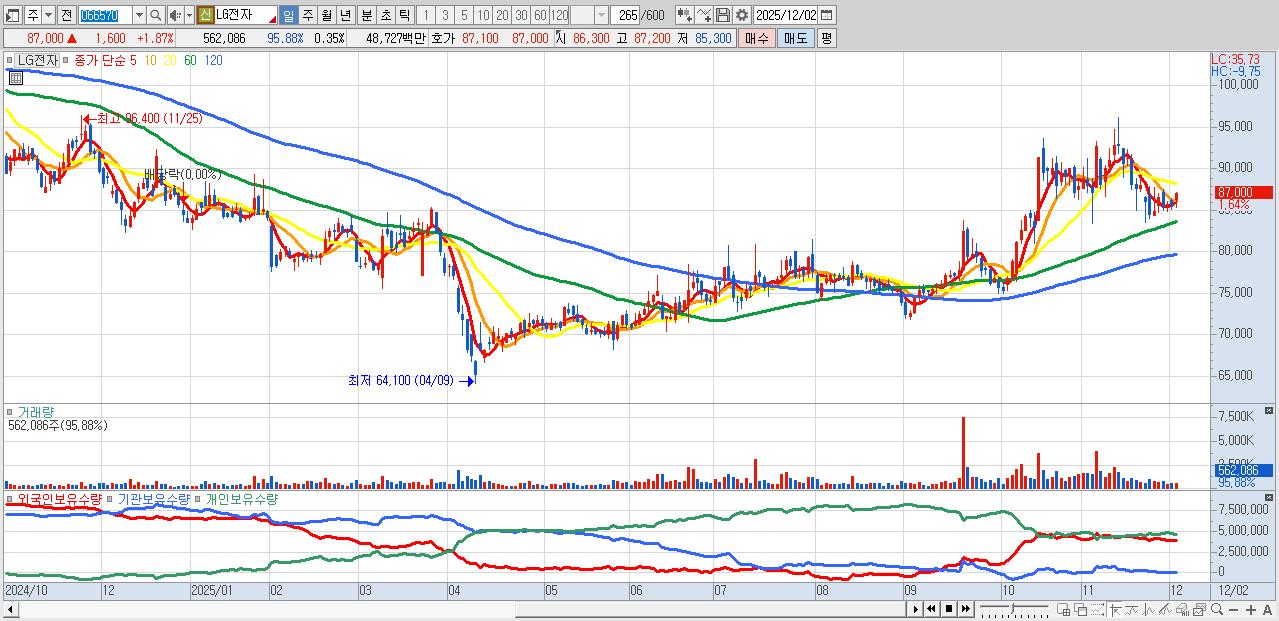 - LG전자 (87,200원 ▲ 2.11% , 시총: 142,037억, 외국인 순매수 거래금:118억)