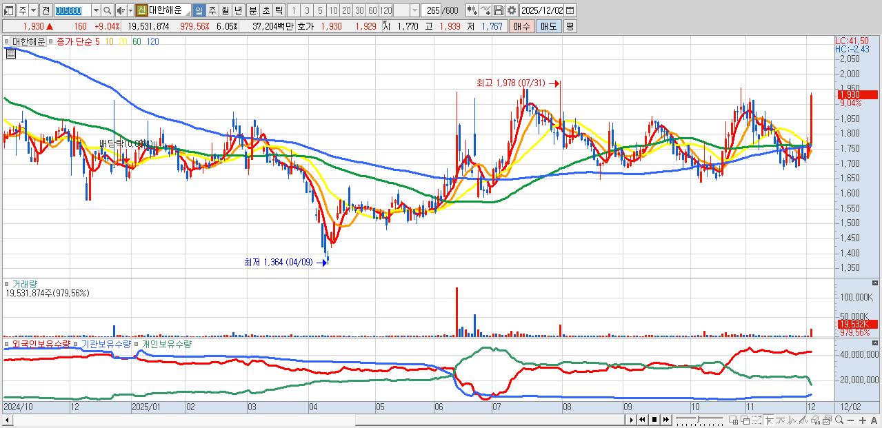 - 대한해운 (1,930원 ▲ 9.04% , 시총: 6,229억, 외국인 순매수 거래금:99억)
