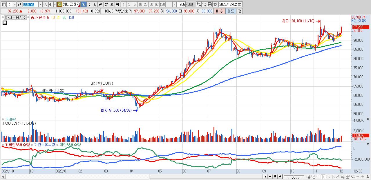 - 하나금융지주 (97,300원 ▲ 3.07% , 시총: 270,811억, 외국인 순매수 거래금:143억)