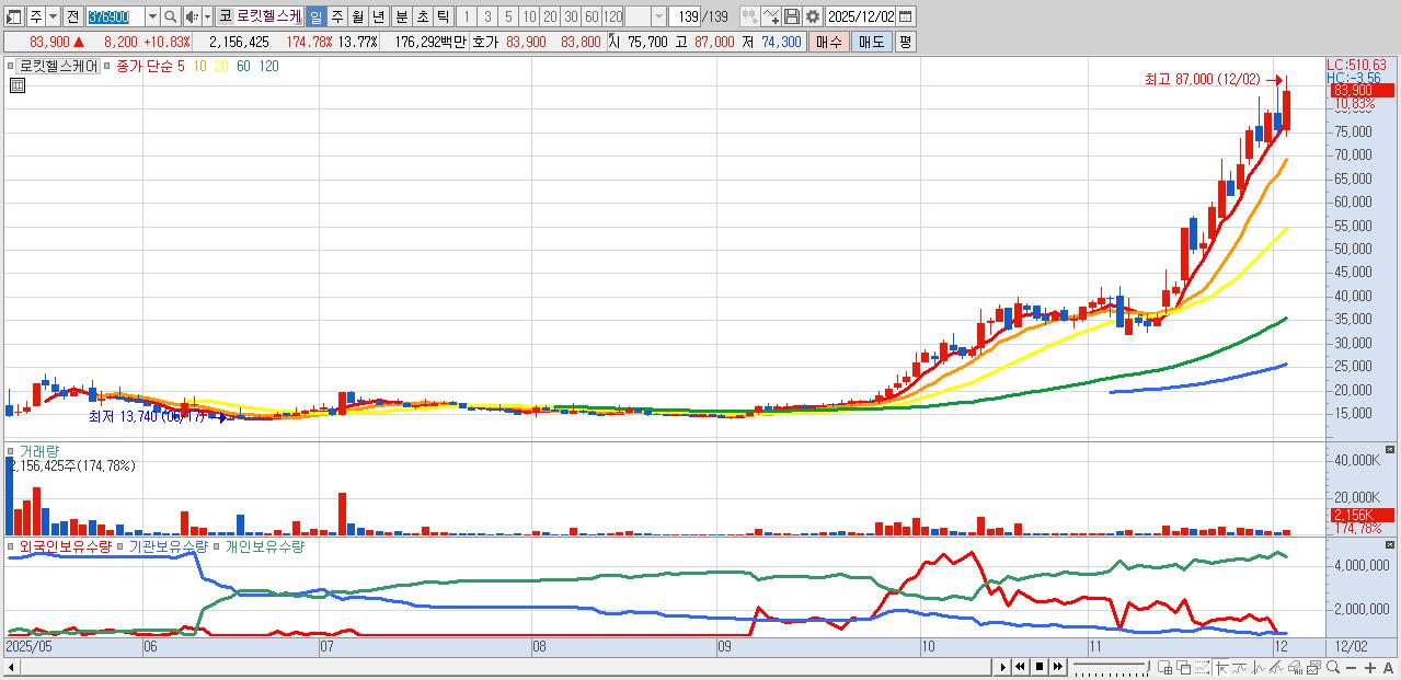 - 로킷헬스케어 (83,900원 ▲ 10.83% , 시총: 13,140억, 외국인 순매수 거래금:188억)