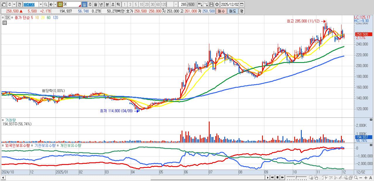 - SK (258,500원 ▲ 2.17% , 시총: 187,419억, 외국인 순매수 거래금:125억)