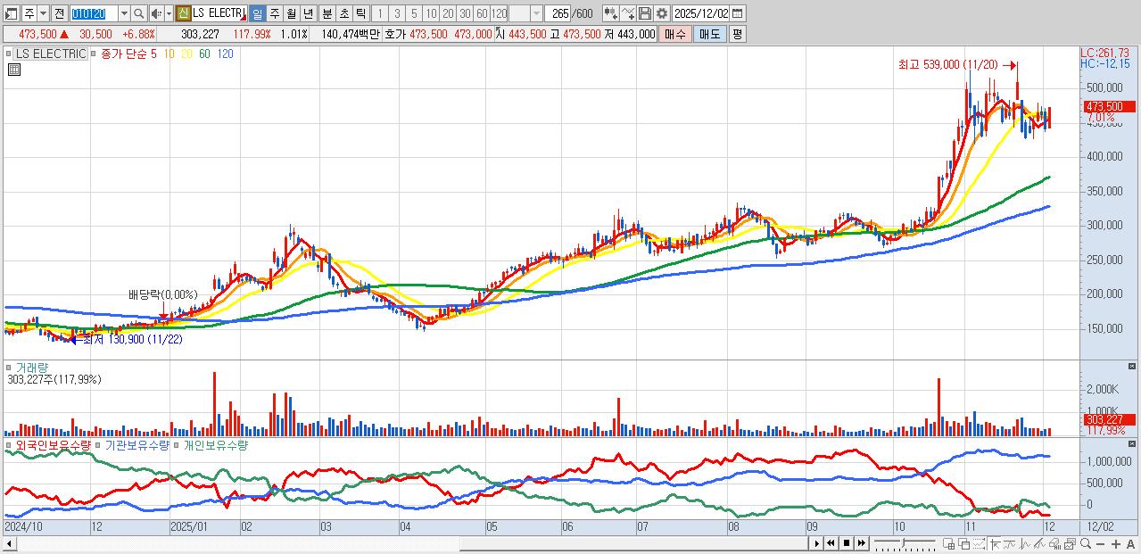 - LS ELECTRIC (472,500원 ▲ 6.66% , 시총: 141,750억, 외국인 순매수 거래금:333억)