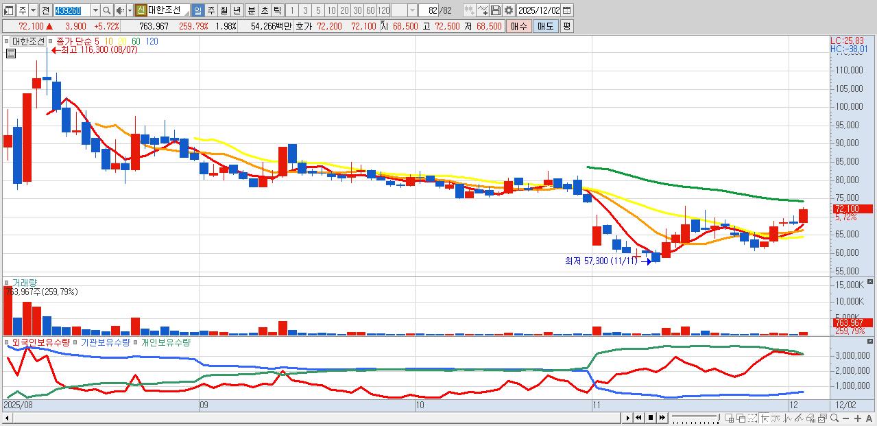 - 대한조선 (72,100원 ▲ 5.72% , 시총: 27,777억, 외국인 순매수 거래금:94억)