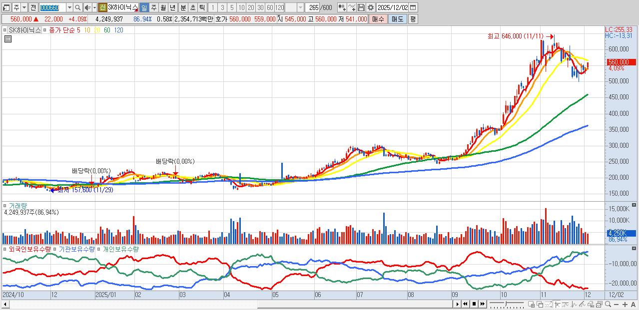 - SK하이닉스 (558,000원 ▲ 3.72% , 시총: 4,062,253억, 외국인 순매수 거래금:2,900억)