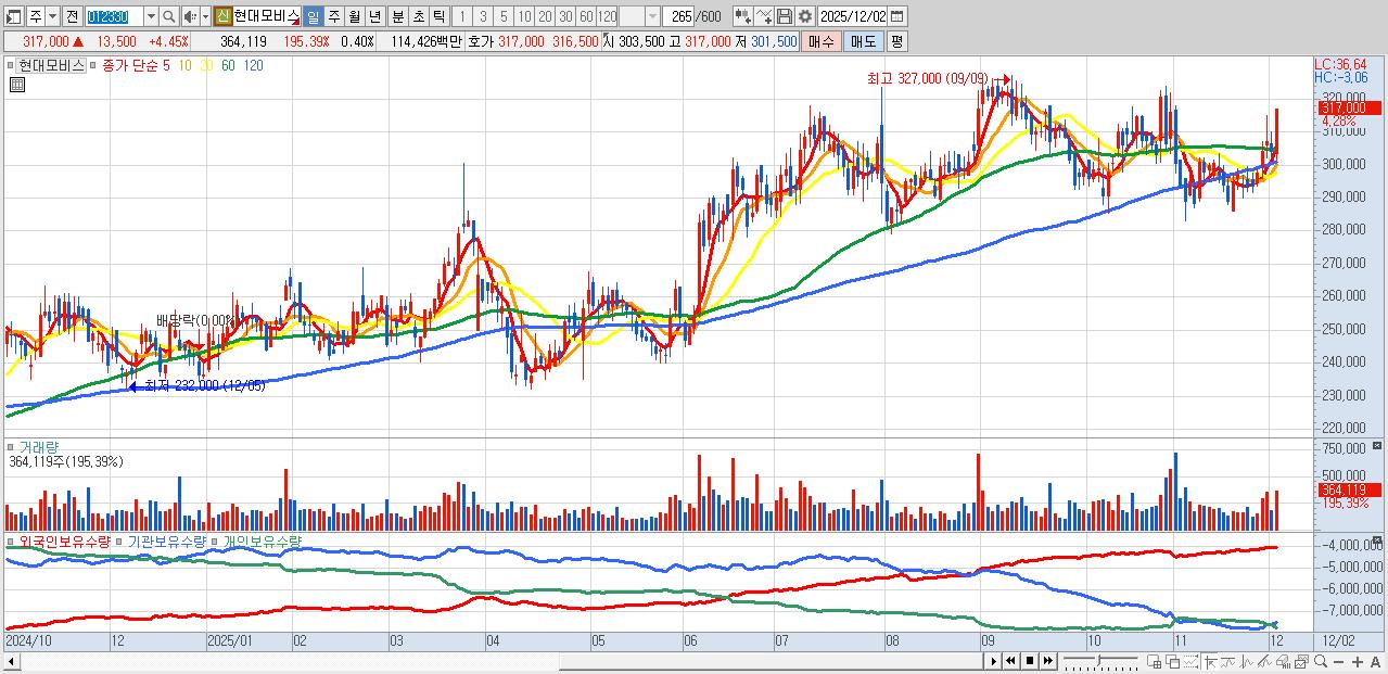 - 현대모비스 (317,000원 ▲ 4.45% , 시총: 287,622억, 외국인 순매수 거래금:314억)