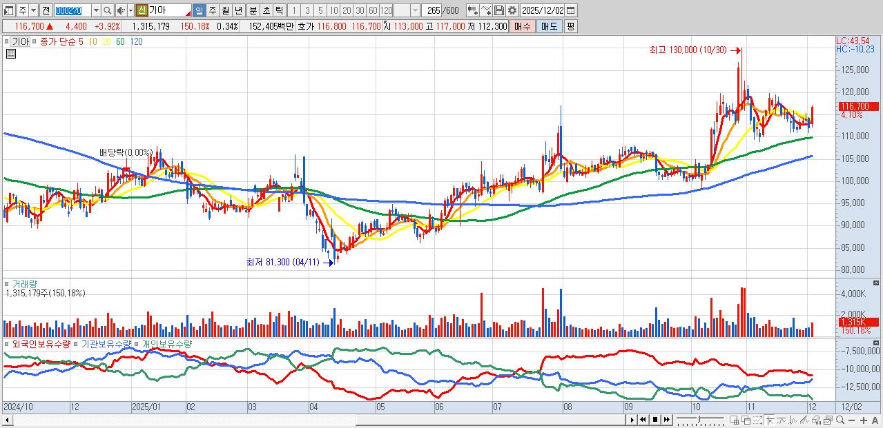 - 기아 (117,000원 ▲ 4.19% , 시총: 456,783억, 외국인 순매수 거래금:318억)