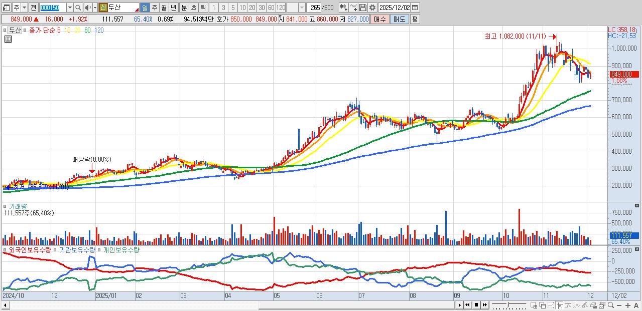 - 두산 (852,000원 ▲ 2.28% , 시총: 137,971억, 외국인 순매수 거래금:92억)