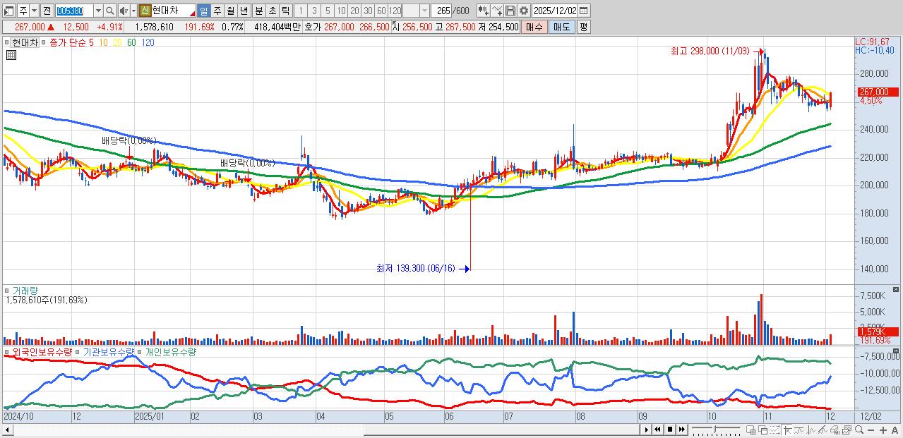 - 현대차 (266,000원 ▲ 4.52% , 시총: 544,656억, 외국인 순매수 거래금:529억)