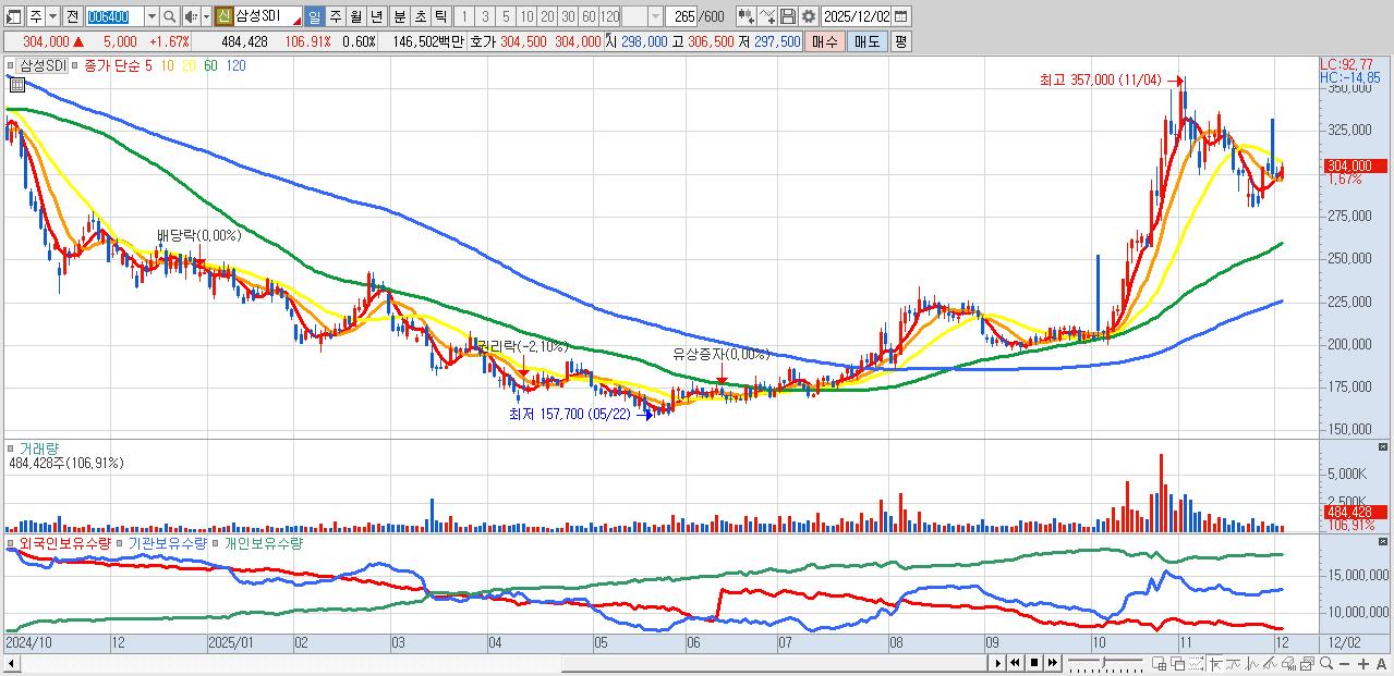 - 삼성SDI (305,000원 ▲ 2.01% , 시총: 245,786억, 외국인 순매수 거래금:88억)