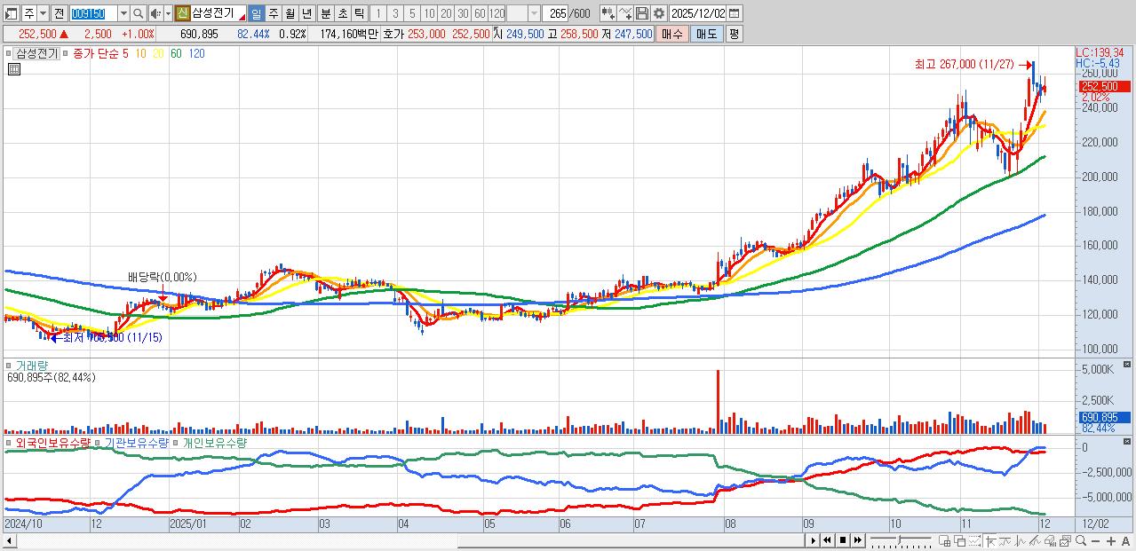 - 삼성전기 (252,000원 ▲ 0.8% , 시총: 188,228억, 외국인 순매수 거래금:94억)