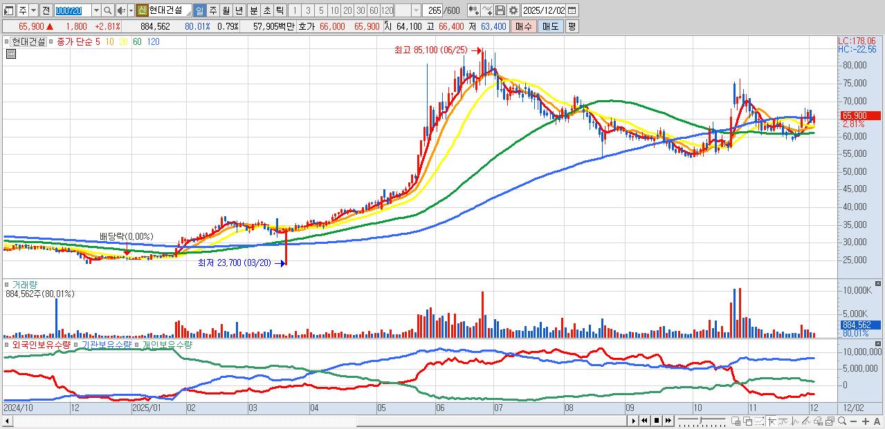 - 현대건설 (65,900원 ▲ 2.81% , 시총: 73,383억, 외국인 순매수 거래금:104억)