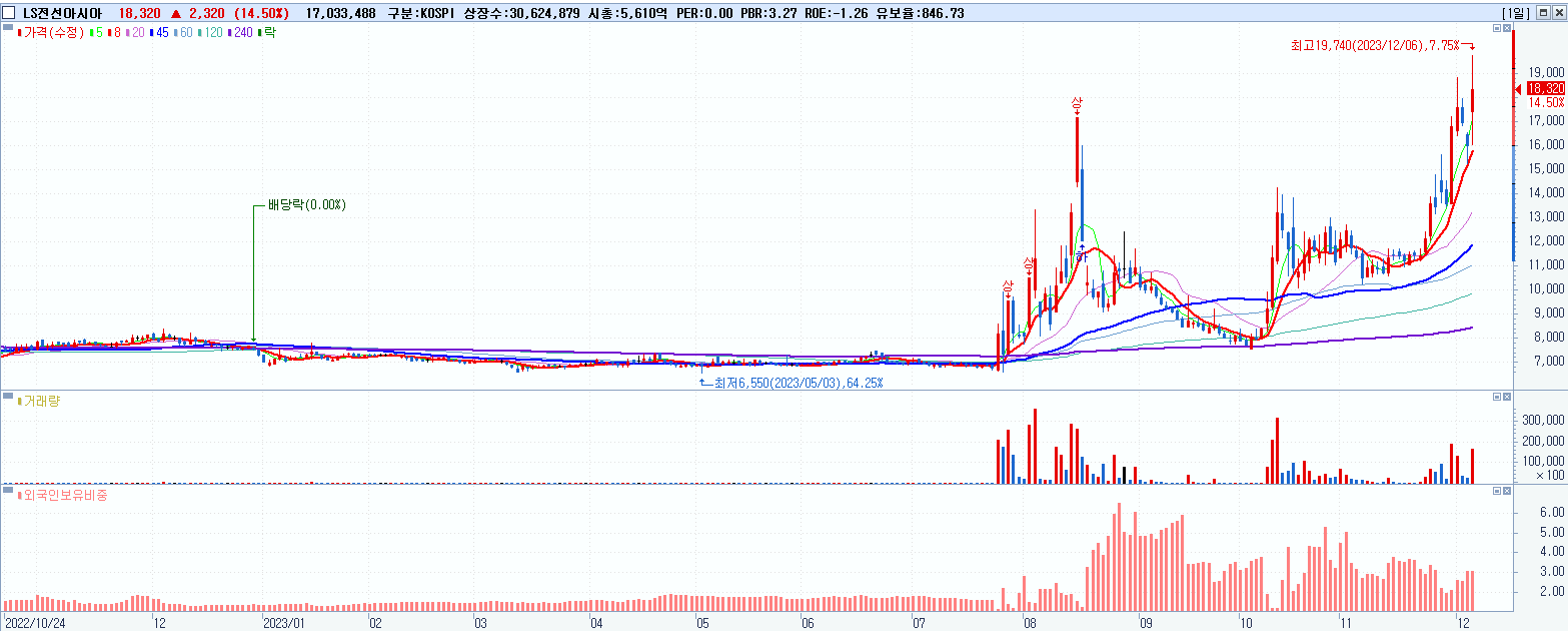 - LS전선아시아 (18,320원 ▲ 14.5% , 시총: 5,610억, 거래량: 17,186,600, 거래대금:3,123억)