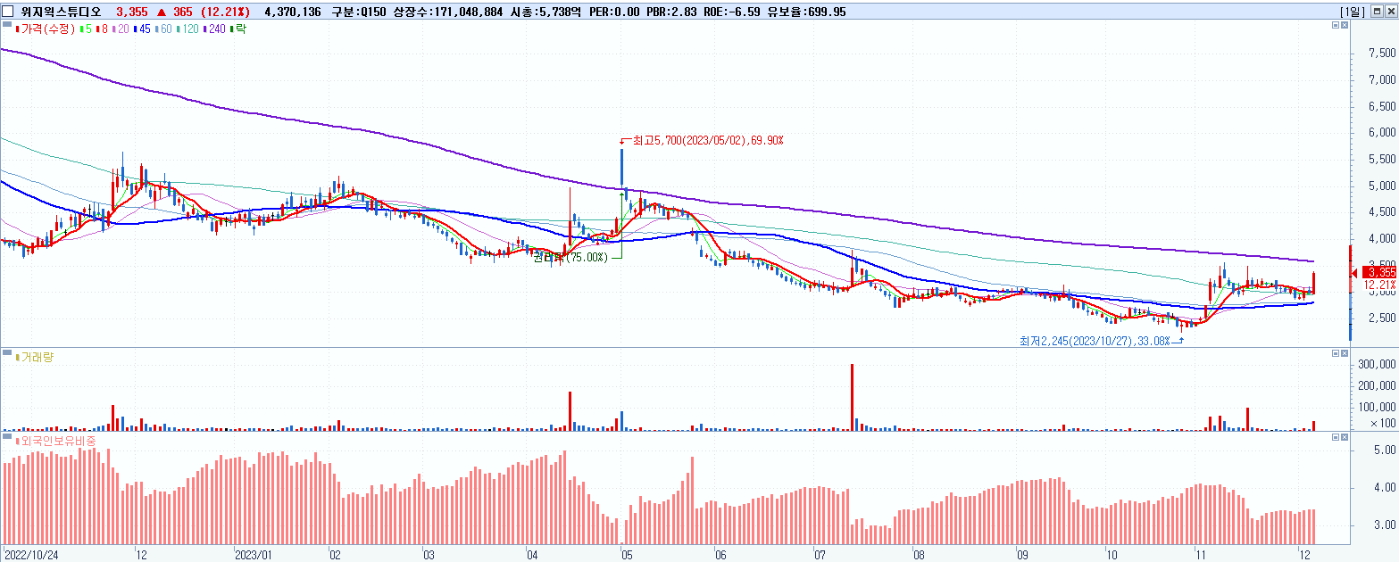 - 위지윅스튜디오 (3,355원 ▲ 12.21% , 시총: 5,739억, 거래량: 4,386,826, 거래대금:142억)