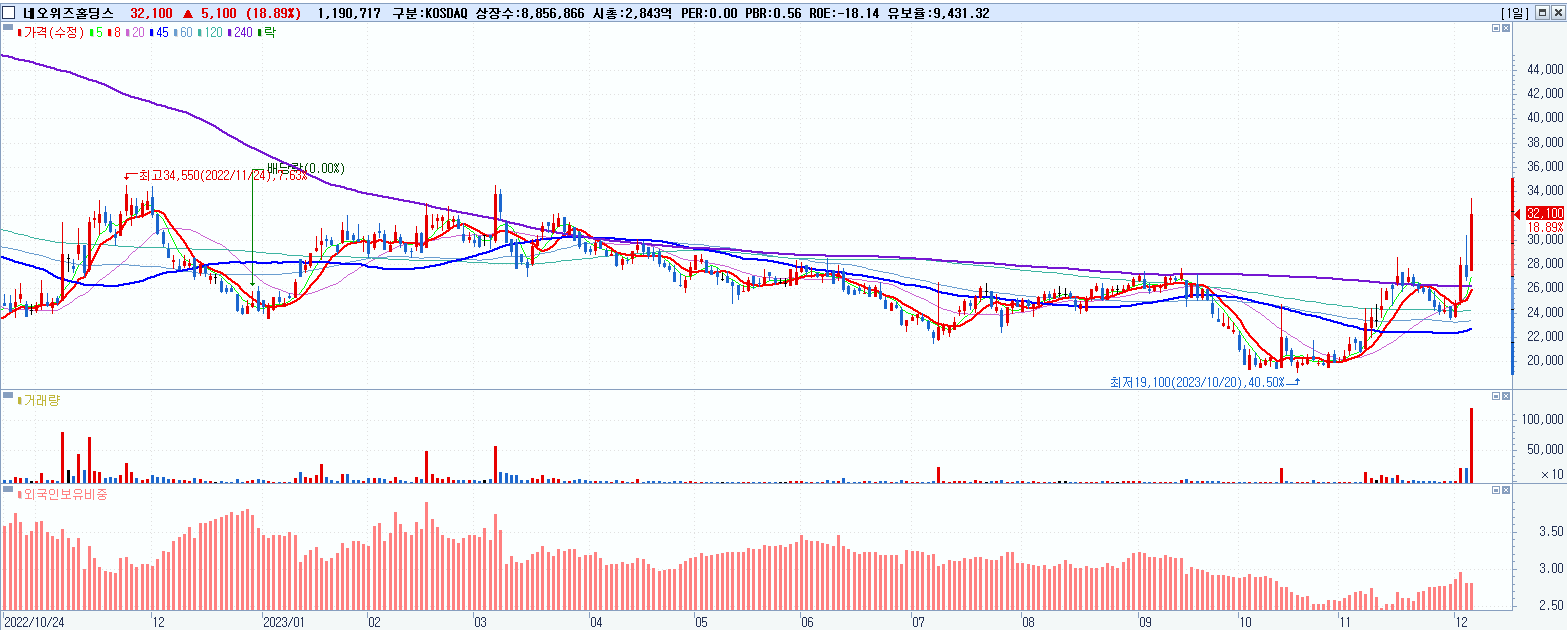 - 네오위즈홀딩스 (32,100원 ▲ 18.89% , 시총: 2,843억, 거래량: 1,195,467, 거래대금:374억)